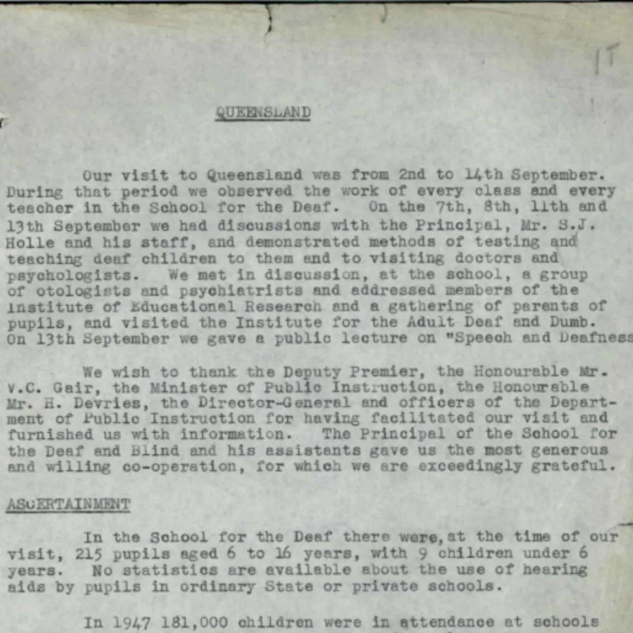 Report by Dr Alexander Ewing and his wife Irene Ewing, “experts” on deaf education who toured Australia in 1950 and had an influence on the uptake of oral methods of education in many places.