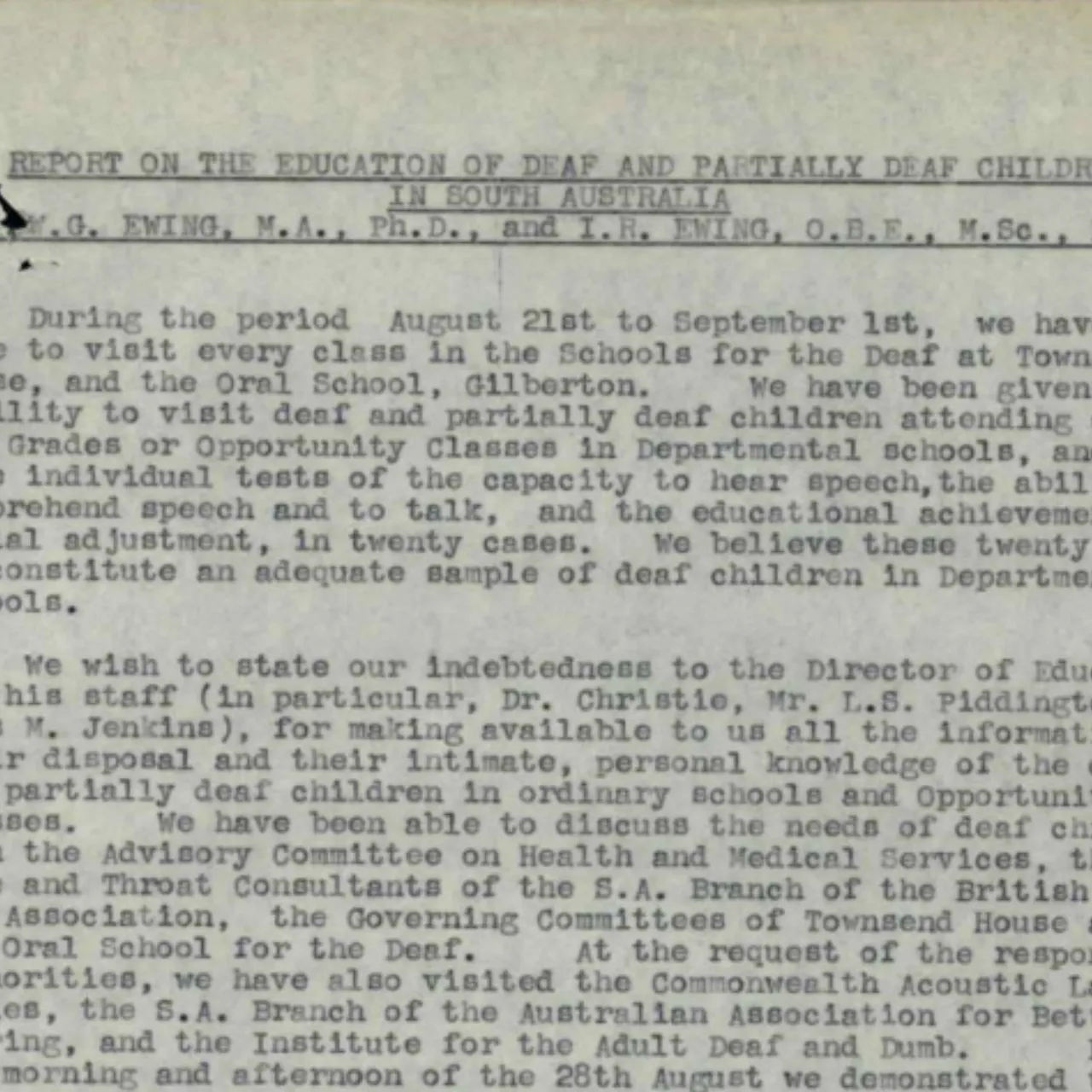 Report by Dr Alexander Ewing and his wife Irene Ewing, “experts” on deaf education who toured Australia in 1950 and had an influence on the uptake of oral methods of education in many places.