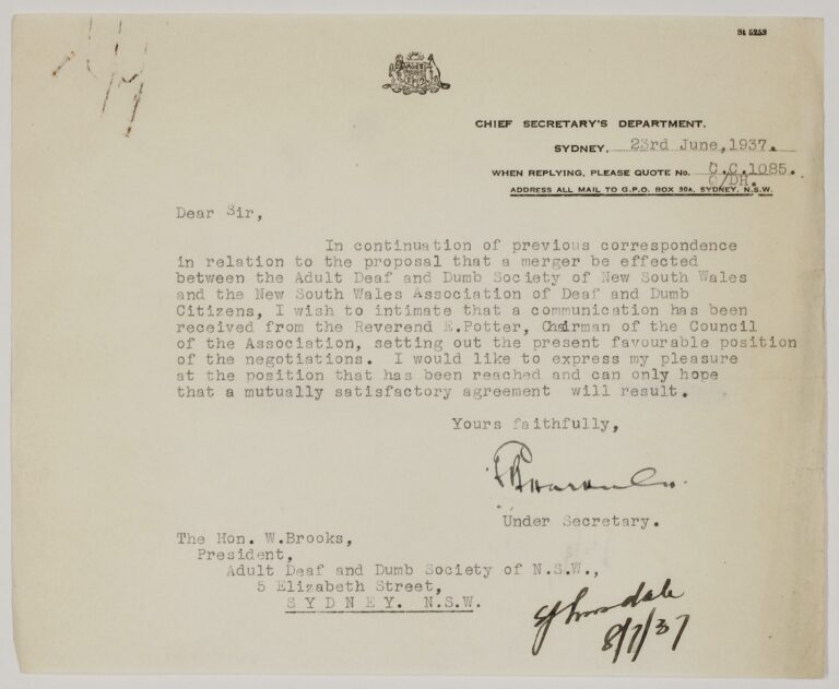 Part of the “Amalgamation File” which contains documents relating to the forced merger of the Association of Deaf and Dumb Citizens in the Deaf Society in 1937.