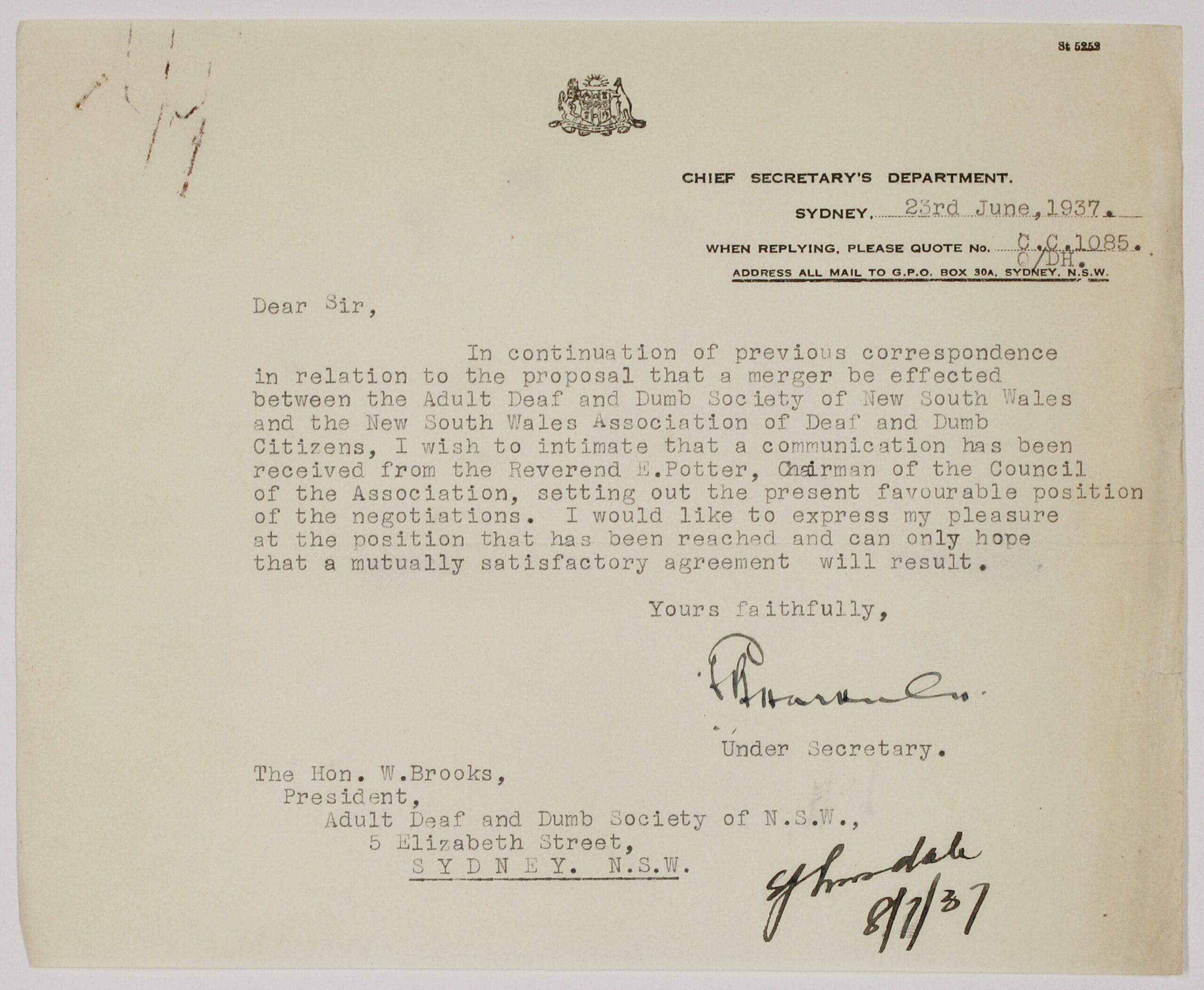Letter from Chief Secretary to Hon W Brooks (Society) 23 June 1937