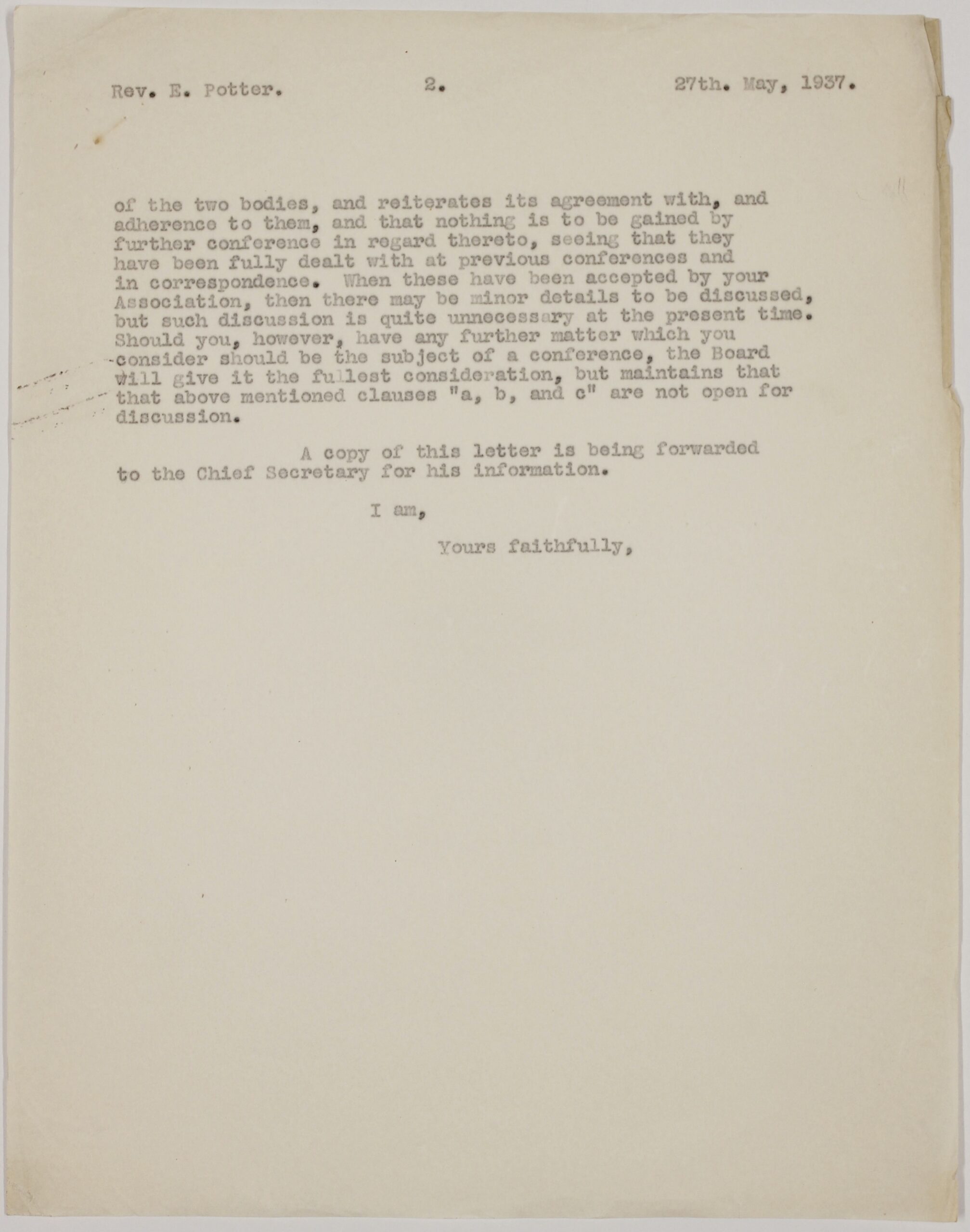 Letter from Edgar Potter (Association) to Hon W Brooks (Society) 10 June 1937