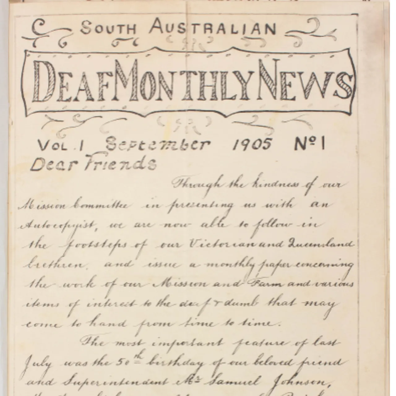 The South Australian Deaf Mission appears to have acquired a machine for copying documents (called an “autocopyist”) and proudly announce that, like Victoria and Queensland, they are now able to produce a monthly newsletter of the Deaf Community in South Australia.