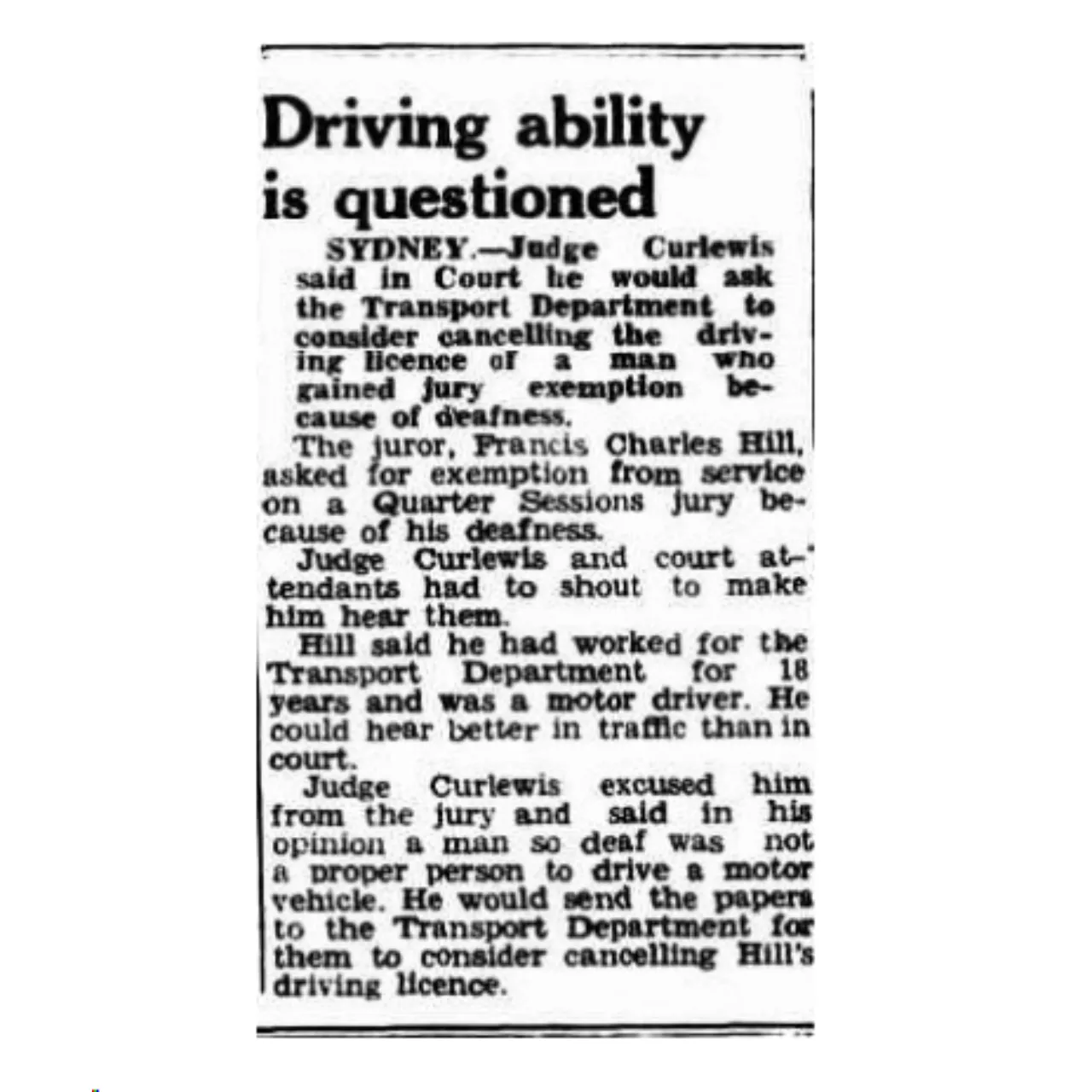 Driving ability is questioned (1949, November 18). The Evening Advocate (Innisfail, Qld. : 1941 - 1954), p. 1. Retrieved January 3, 2024, from http://nla.gov.au/nla.news-article212391136