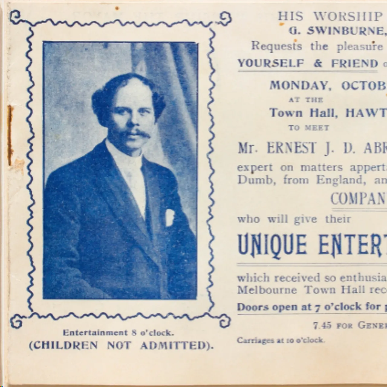 His worship the mayor G. Swinburne, Esq. M.L.A requests the pleasure of the Company of yourself and friend on the evening of Monday, October 20, 1902 at the town hall Hawthorne to meet Mr. Ernest, J.D. Abraham, F.I.M.D., expert on matters appertaining to the Deaf and Dumb, from England, and company of Deaf Mutes who will give their unique entertainment which received so enthusiastic a reception in the Melbourne Town Hall recently.