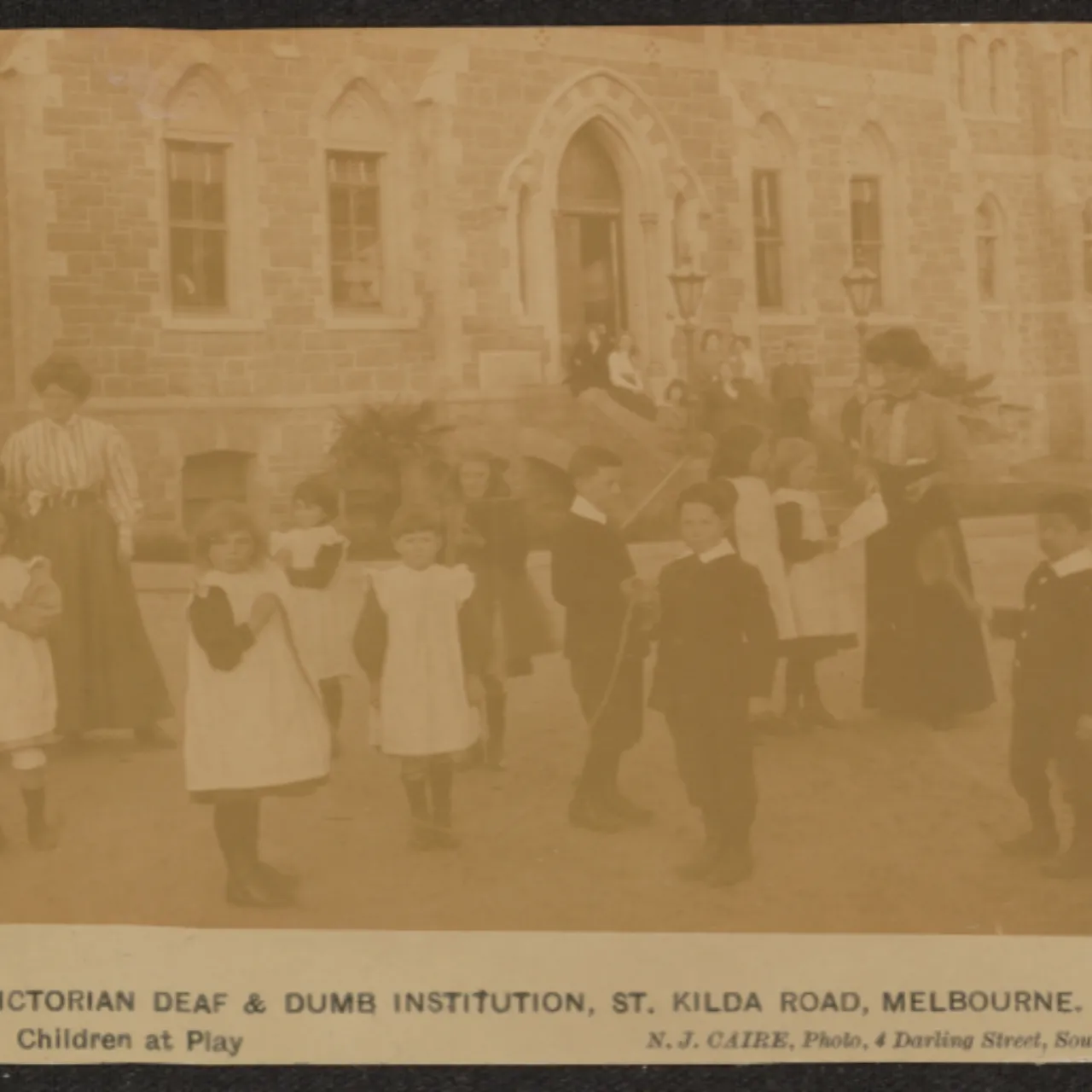 Caire, Nicholas, 1837-1918 & Caire, Nicholas, 1837-1918. (1909). Children playing at the main entrance, Victorian Deaf and Dumb Institution, St. Kilda Road, Melbourne, 1909 / N.J. Caire.