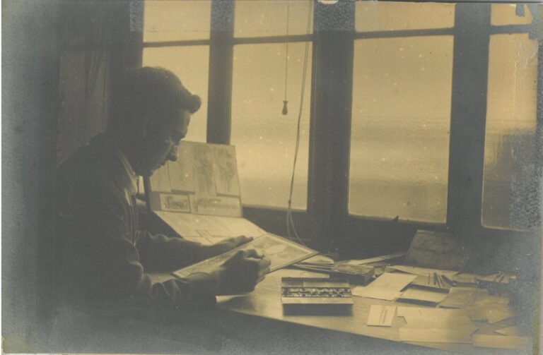This photograph shows Colin Fairweather working at his desk, with his artist’s materials around him (date unknown).