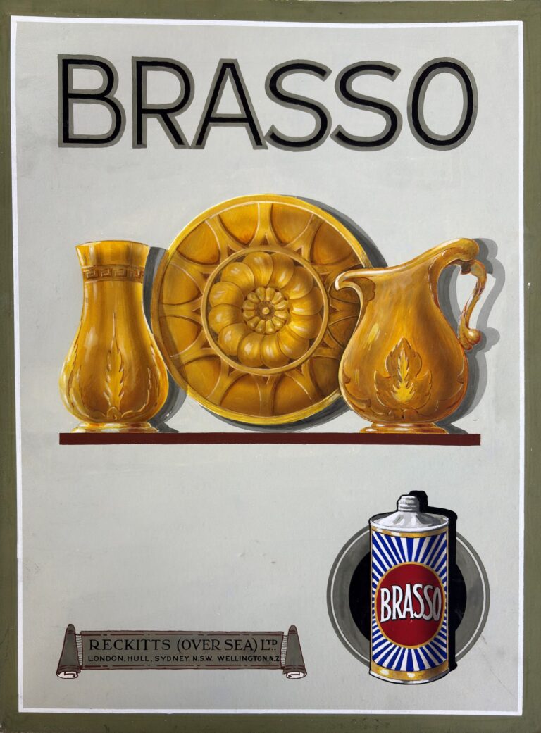 Colin prepared artwork for advertisements. This looks like a draft or preliminary design for an advertisement for ‘Brasso’.