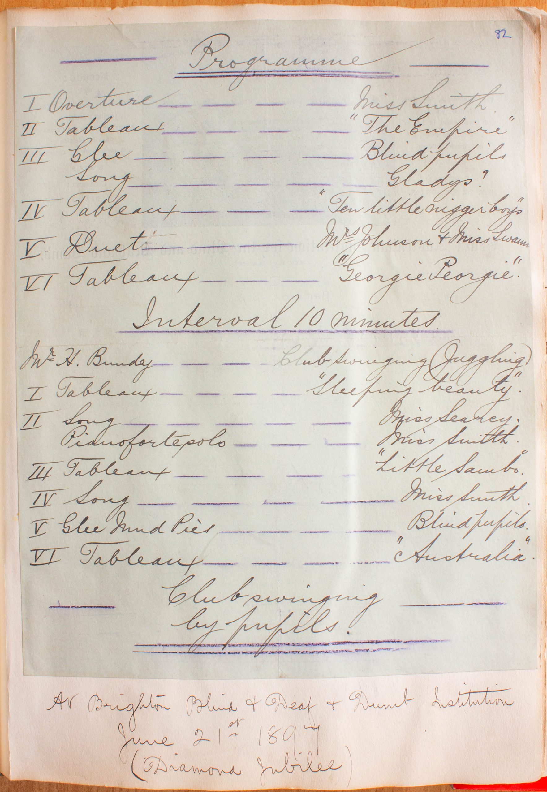 In 1897, the South Australian Institution for the Blind and Deaf and Dumb in Adelaide celebrated their diamond jubilee with a concert for the public. This is the hand-written program. There were several “Tableaux” (similar to “living statues”) performed by the deaf students.