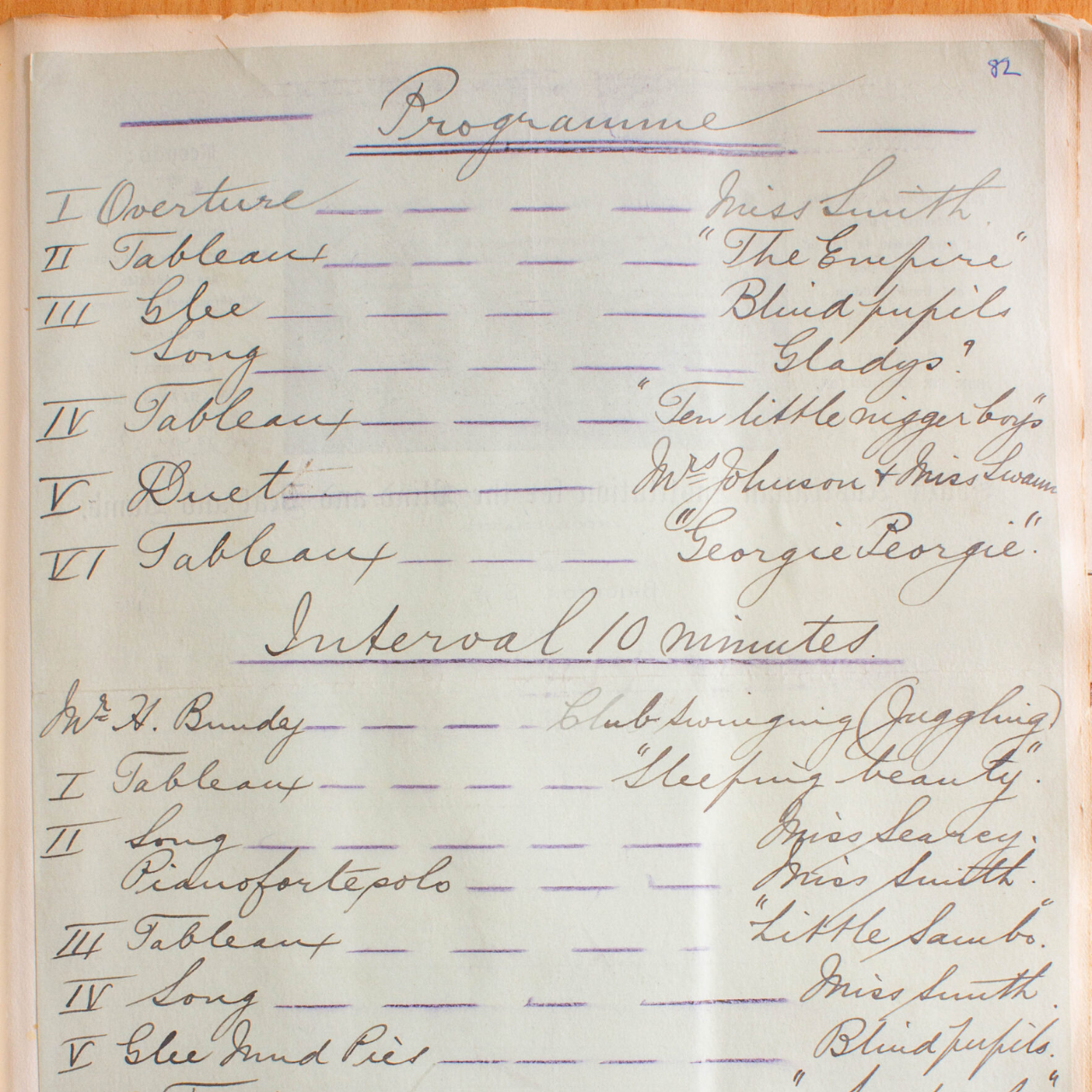 In 1897, the South Australian Institution for the Blind and Deaf and Dumb in Adelaide celebrated their diamond jubilee with a concert for the public. This is the hand-written program. There were several “Tableaux” (similar to “living statues”) performed by the deaf students.