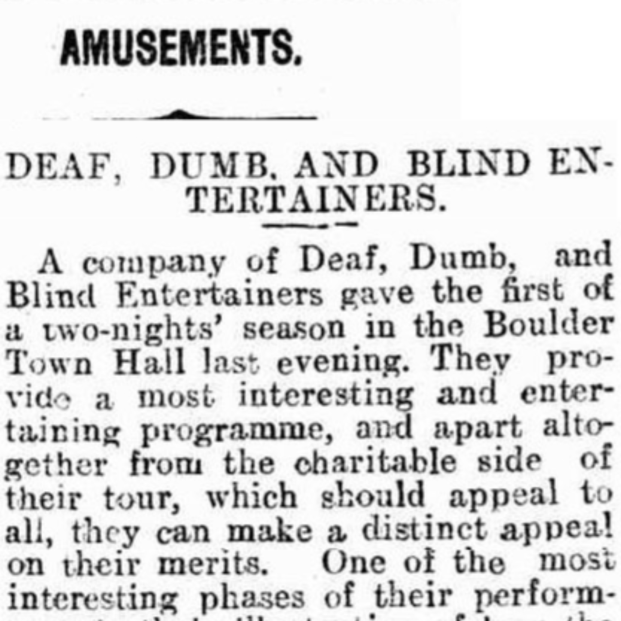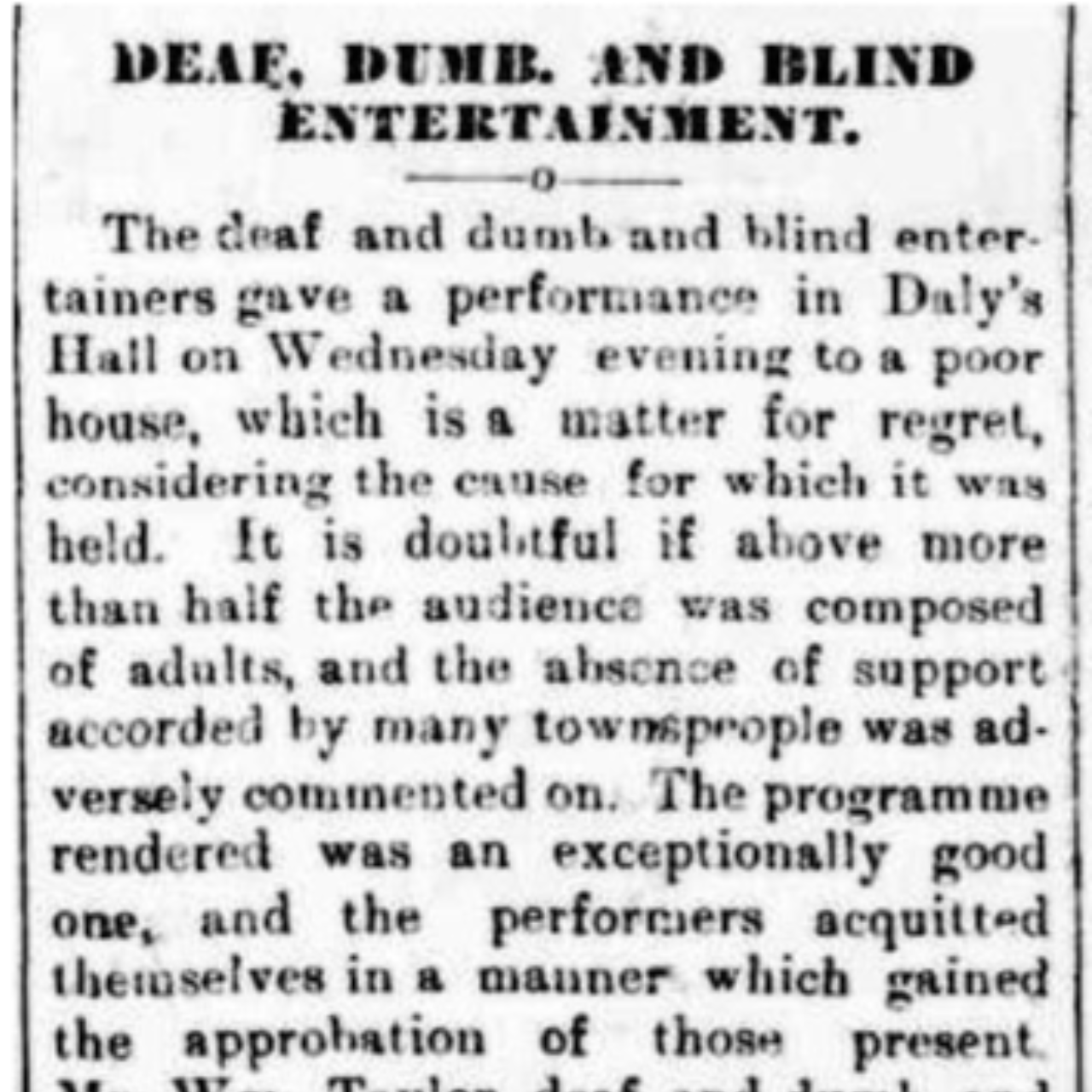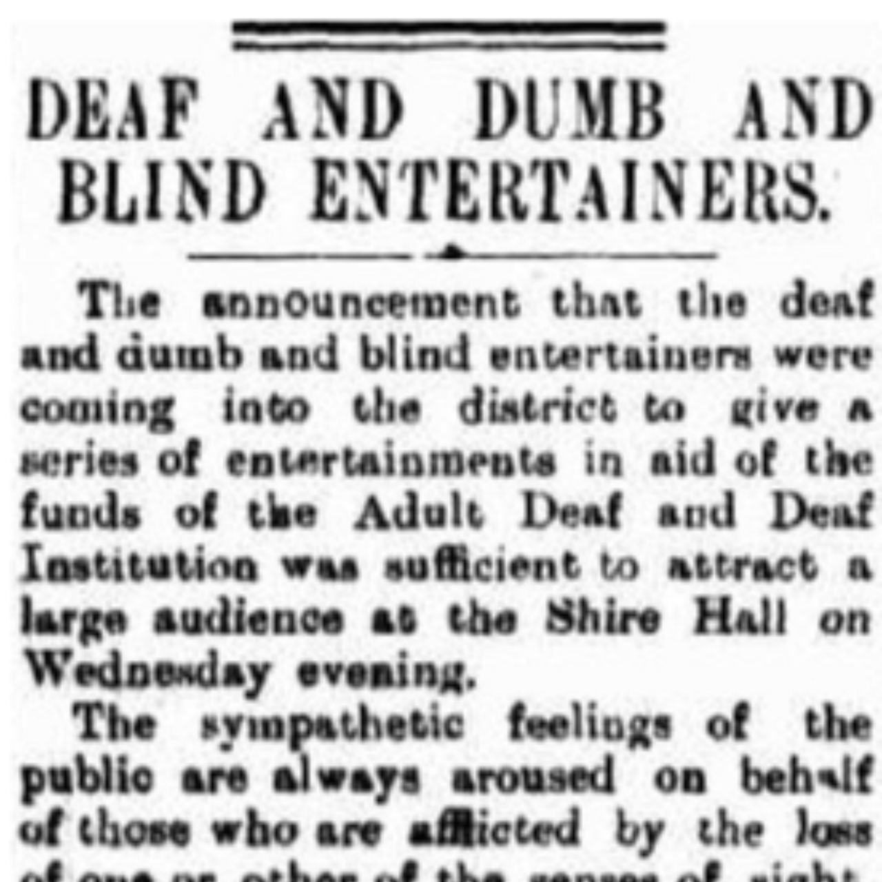 “One of the items which particularly interested the audience was a deaf and dumb recitation of ‘The Charge of the Light Brigade.’ Two members of the company went through the performance together, one by finger spelling and the other by signs and gestures, which were interpreted by a deaf man, who, prior to being instructed in the oral system, had also been regarded as dumb.”